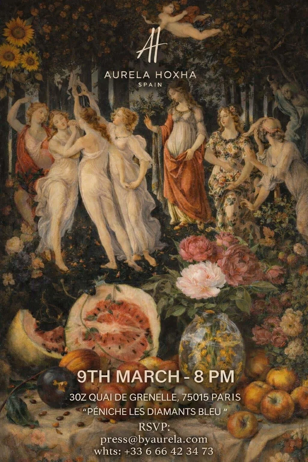 Les modèles étaient déjà vêtues de leurs robes, elles ressemblaient à des figures échappées d'une toile de Botticelli — exactement l'esprit de l'invitation.